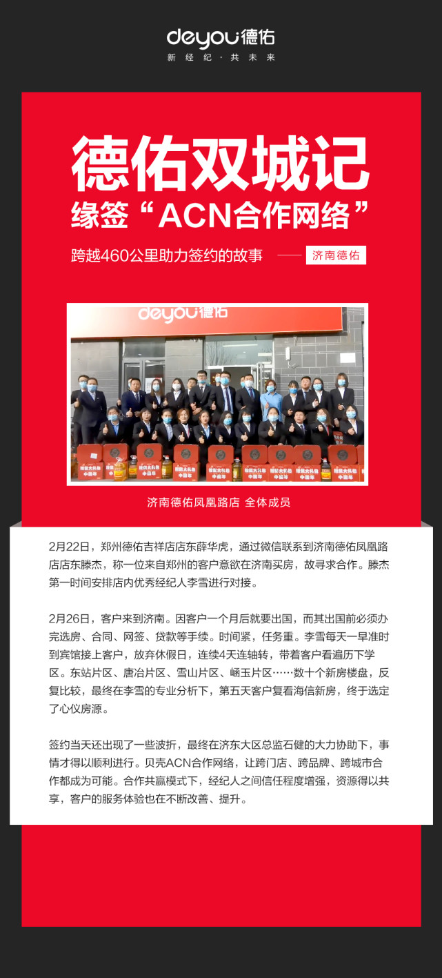 2月22日,郑州德佑吉祥店店东薛华虎,通过微信联系到济南德佑凤凰路店店东滕杰,称一位来自郑州的客户意欲在济南买房,故寻求合作。滕杰排名前列时间安排店内优秀经纪人李雪进行对接。