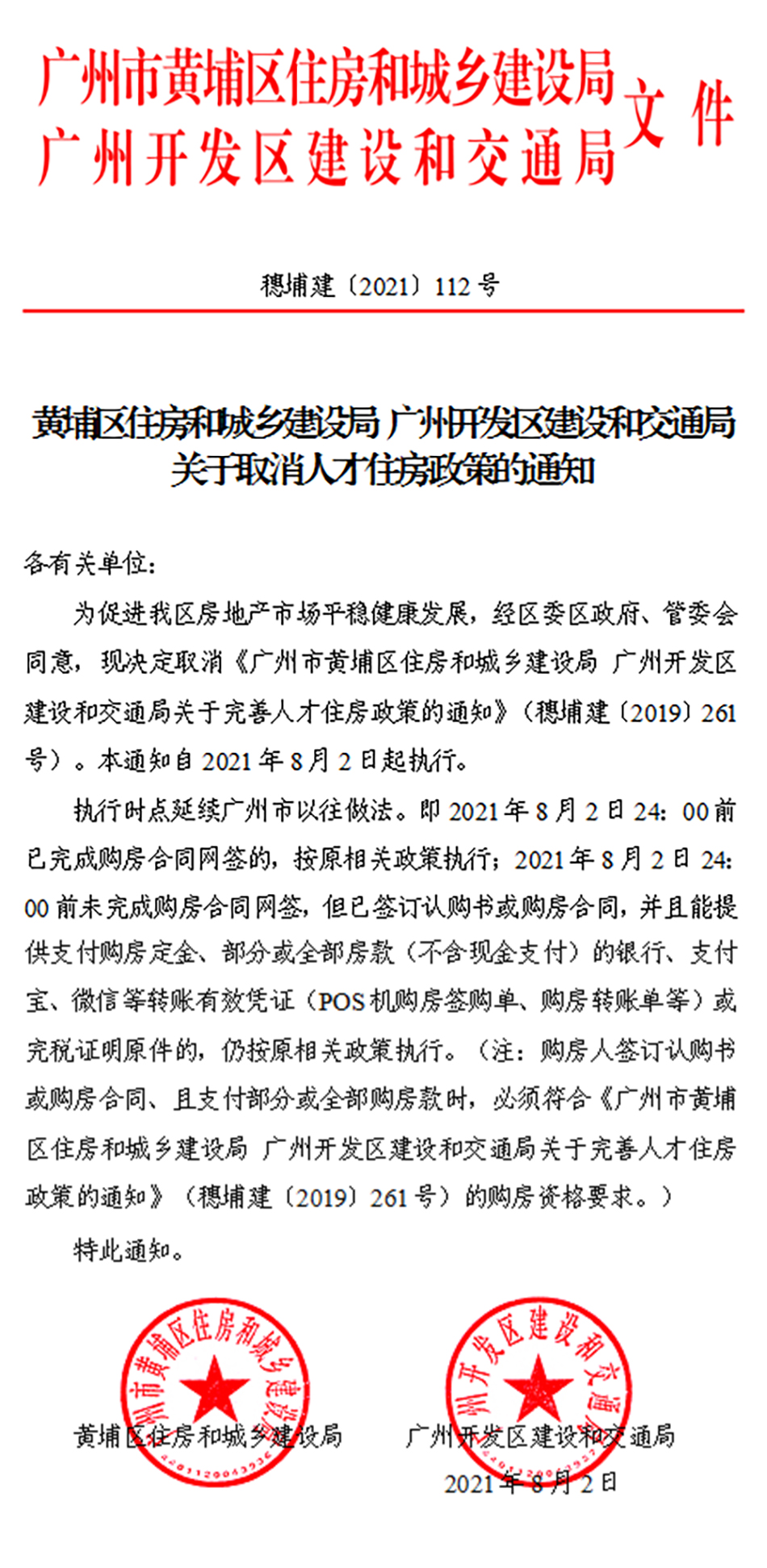 8月2日,广州市黄埔区住房和城乡建设局、广州开发区建设和交通局发布《关于取消人才住房政策的通知》(以下简称《通知》),称决定取消人才住房政策。
