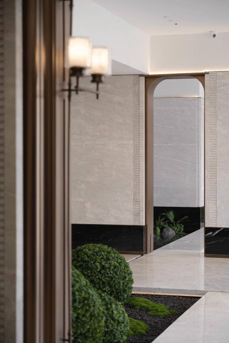 2号楼打造的绿岛艺境,将“自然艺术”化为可感知的空间诗学。空间墙面与地面一体铺陈石材,并借由精妙高差,营造出“浮岛”般的悬浮意境,令人仿佛漫步于一片静谧而灵动的艺术岛屿之中。