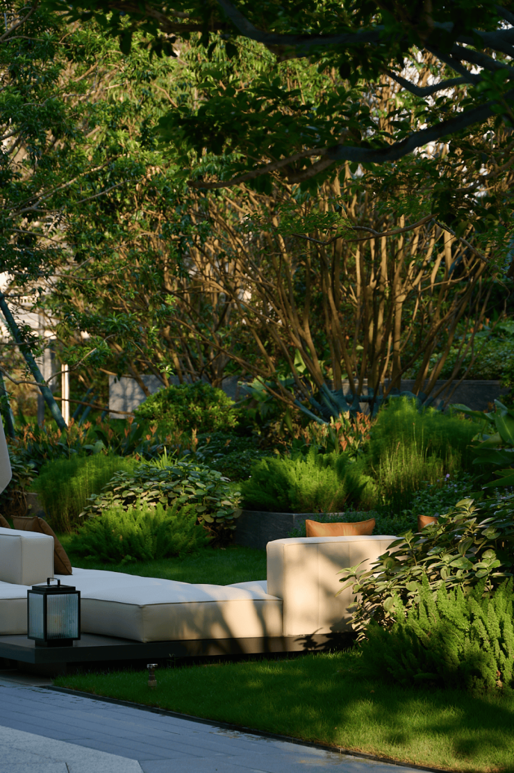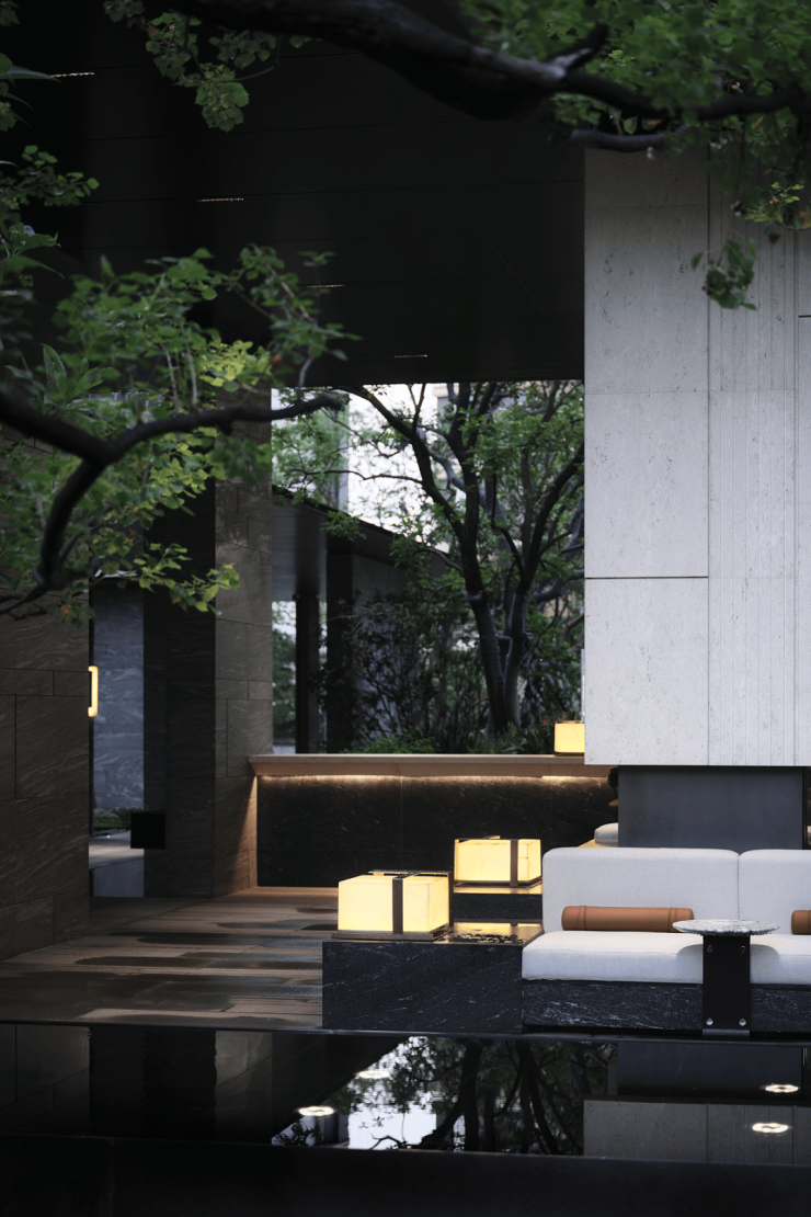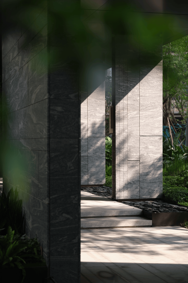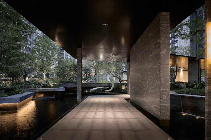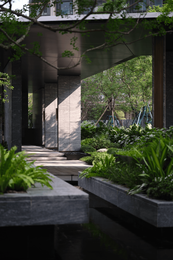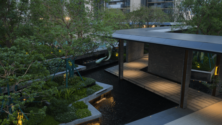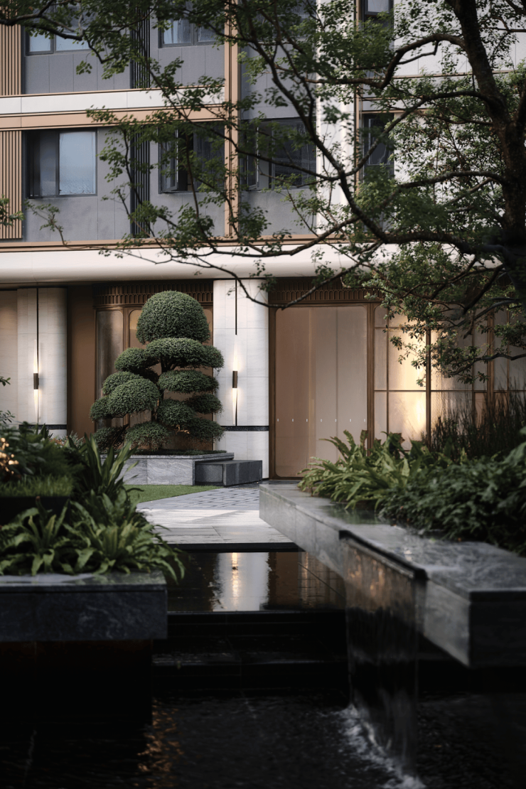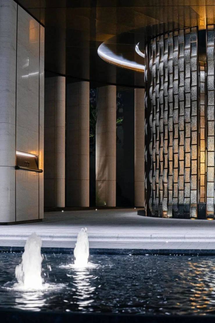 三重叠水映照天光,潺潺流水自石阶泻落,如镶嵌于绿意中的玲珑瀑布。玉如意雕塑、高阶石材与之相映,构筑出一方静谧与艺术交融的境地。