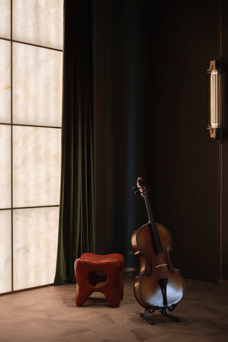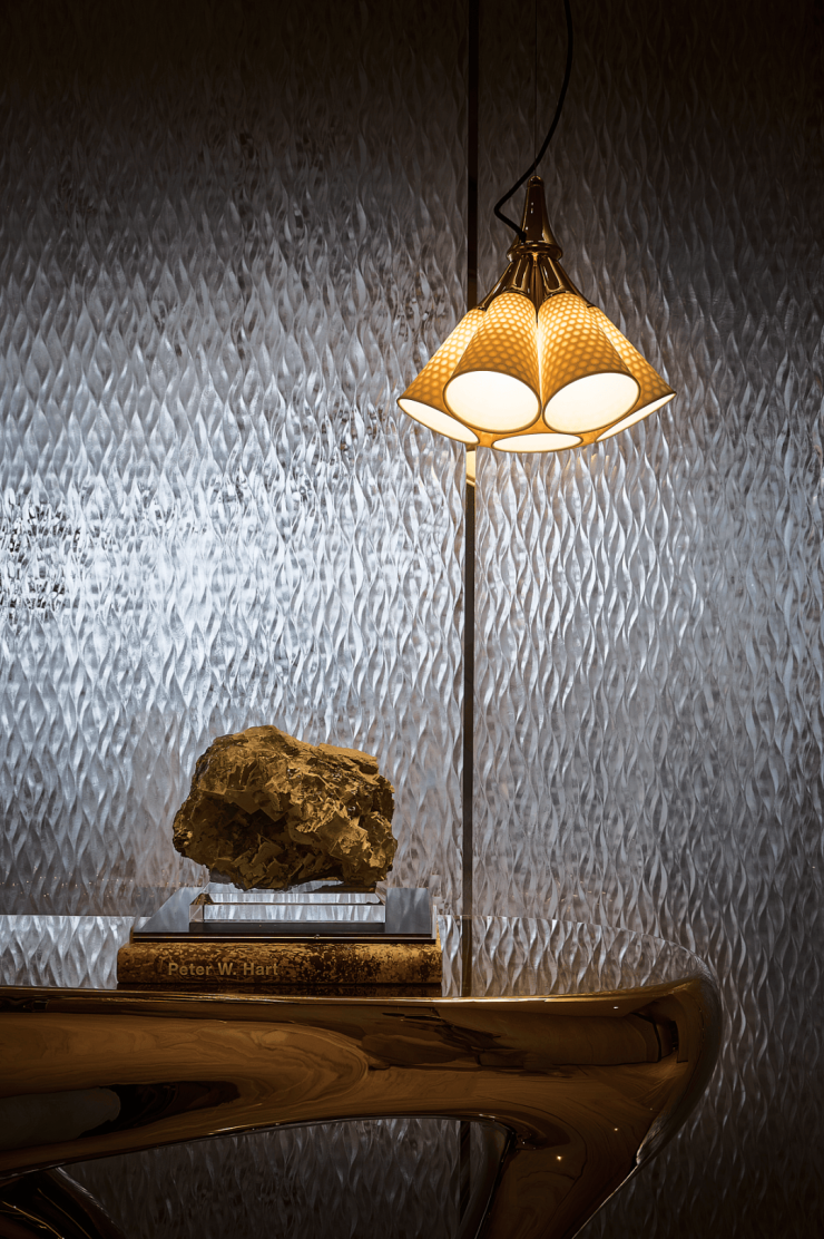 艺术主题空间以蒂芙尼石材、古铜金属、艺术漆等材质铺陈,细节处尽显美学深度。艺术过厅中,深浅石材与发光玉石交织,层次丰富,营造出强烈的视觉张力与沉浸氛围。