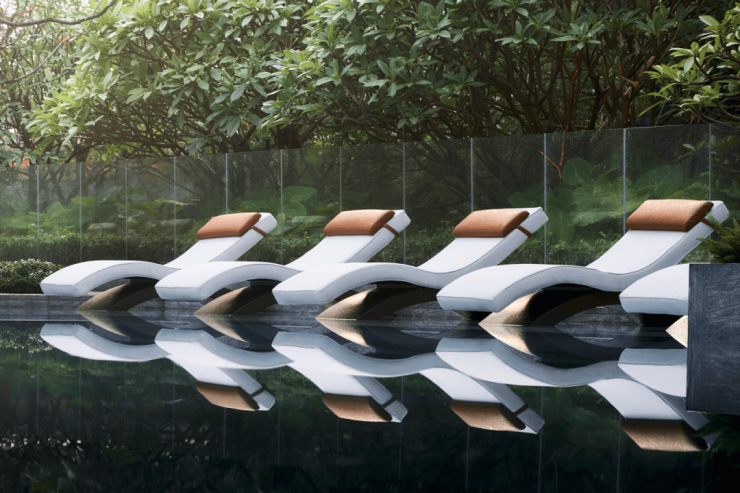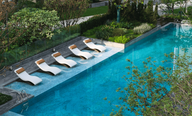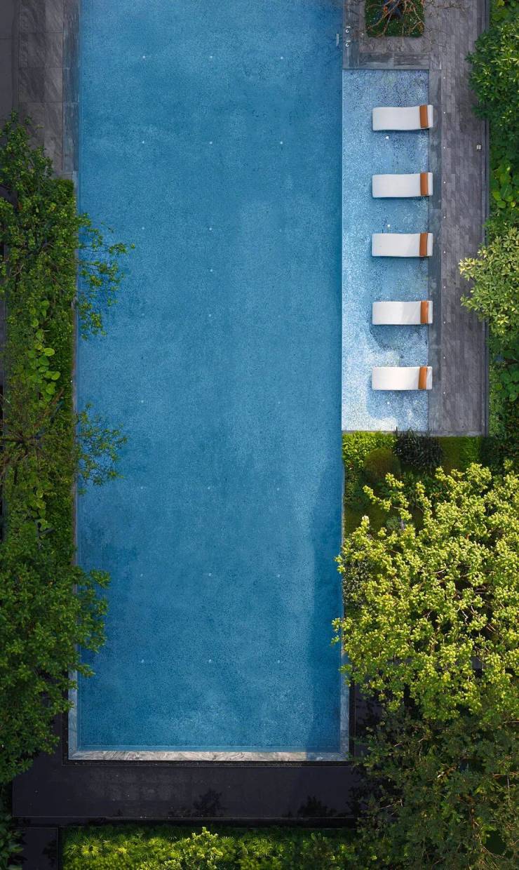 星空泳池与湿地景观浑然相接,绿意围绕,私密且惬意,无论是卧于阳光躺椅,还是安坐社交廊架,独享专属时光,在池畔躺椅或廊架下小憩,安心而从容。