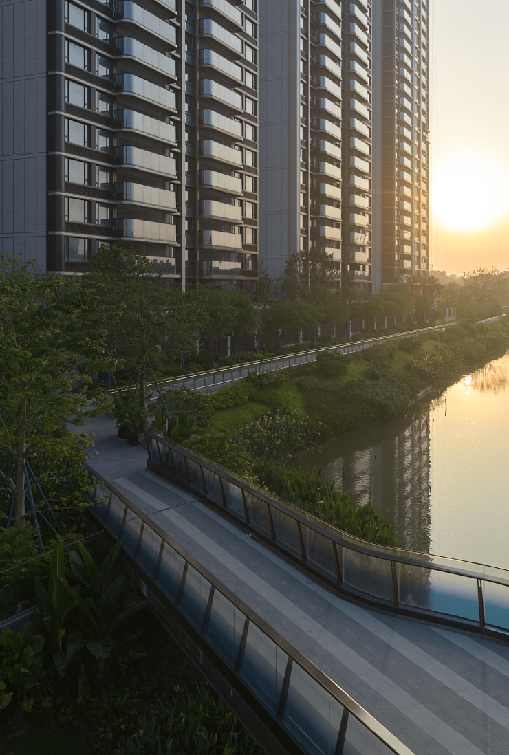 业主的生活半径,不再局限于社区园林,更延展至滨水步道、商业街区、海珠湿地的自然意境之中。下楼即度假,在水岸草坪上搭一顶帐篷,享受城市微露营;尽享15分钟无界惬意慢生活。沿生态水岸慢跑,与自然的一切美好不期而遇,更可在滨水商业区品味咖啡、轻食与西餐,独享一片悠然时光。