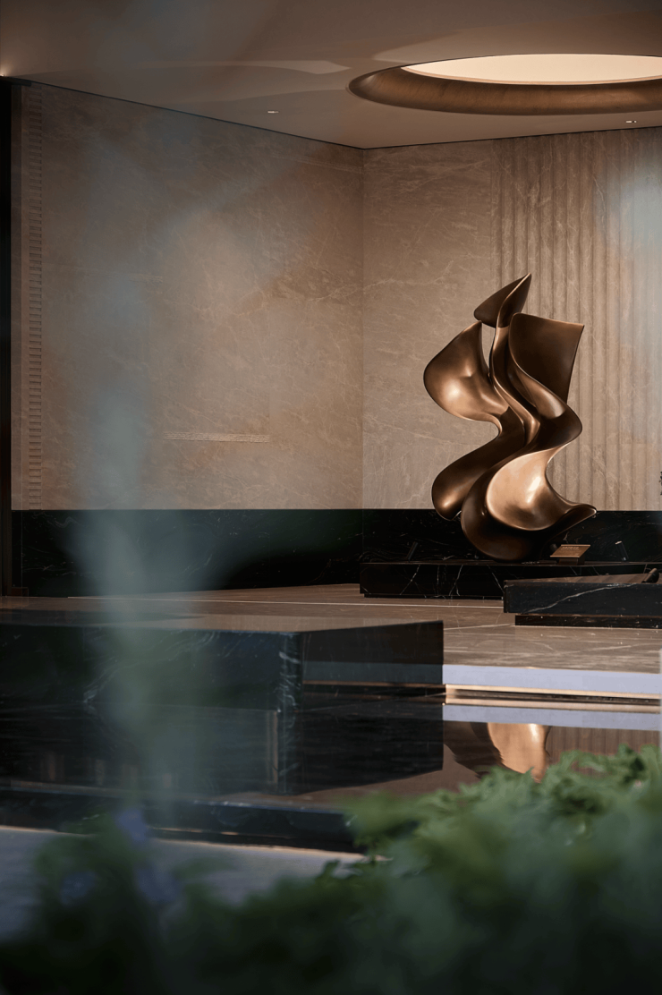 从会所大堂的第一步开始,迎接您的便是超60米恢弘门厅,恍若步入华尔道夫酒店的璀璨梦境。圆柱形水纹玻璃流转光影,乳白色“洞天归源”艺术雕塑静默对话,每一步移动,皆成风景,让业主归家拥有无与伦比的仪式感与尊崇感。