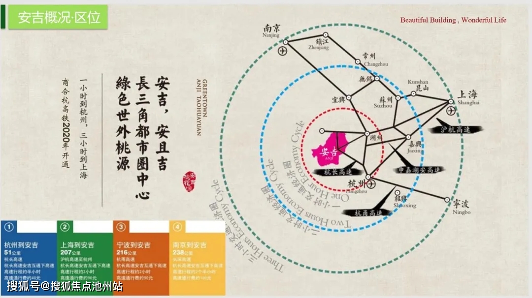 2、区域潜力:安吉是“联合国人居奖”少有获得县、也是“绿水青山就是金山银山”理论的提出及实践点城市、 全国排名前列生态县。植被覆盖率约71%,被誉为气净、水净、土净的“三净之地”。同时,安吉也是杭州都市圈重要的西北节点,近则接轨杭州城西科创大走廊,远则通联上海、南京等长三角重点城市,是整个环杭都市圈的下一个风口。