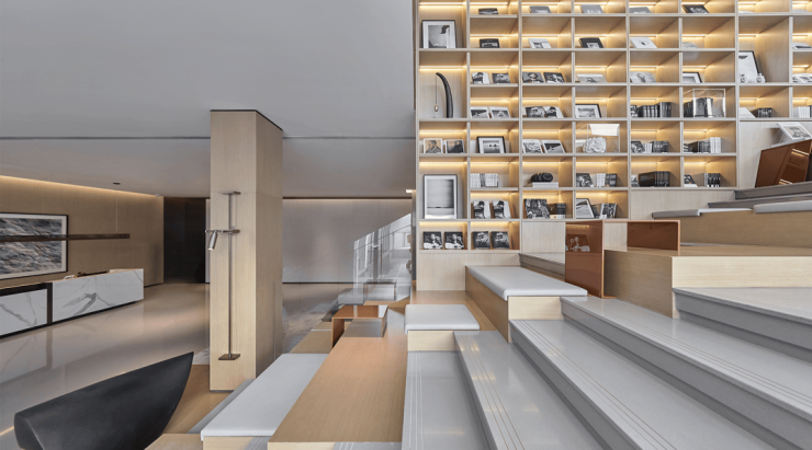 阶梯式书厅,与室外盈盈水景延展出无限诗意,为阅读增添意境。