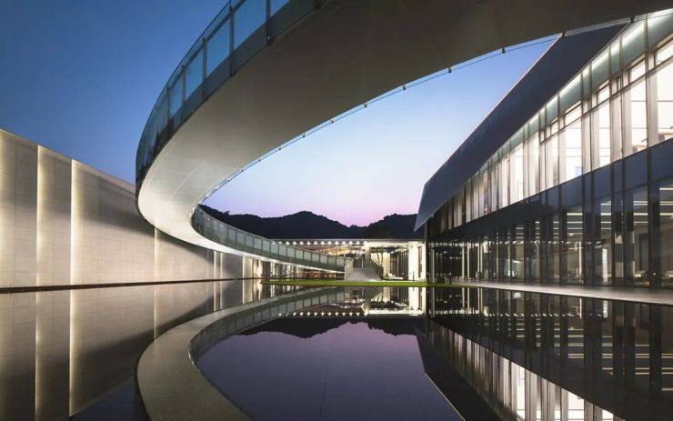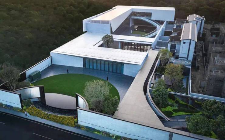 航拍镜头下,一个不规则的白色极简盒子,在山林里绽放,既超脱尘俗,又与周遭浑然一体。