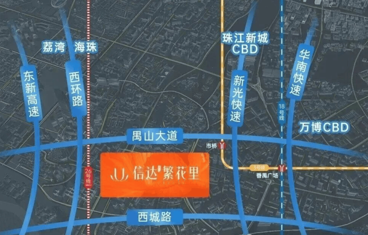 周边有禺山大道、西环路,通达全城,接驳东新高速快速畅达荔湾海珠,也可接驳新光快速畅达万博CBD、珠江新城CBD,自驾出行方便。