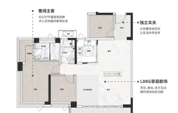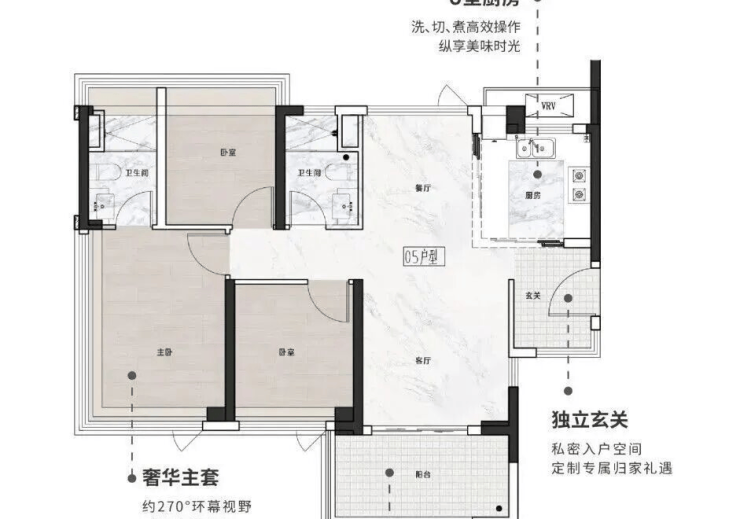 餐客厅一体化设计,连通约7.2米南向阔景阳台,亲友聚会无压力;主卧带步入式衣帽间,私密性更佳。