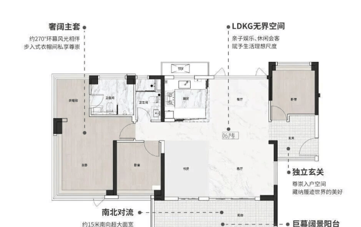 约15米南向超大面宽,媲美200㎡以上顶豪产品的空间尺度感。