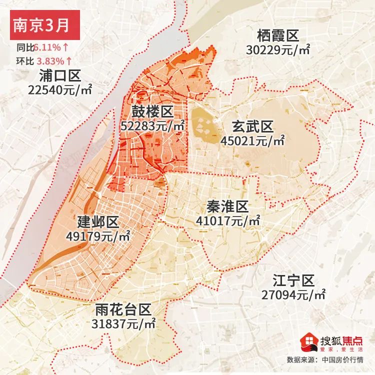 南京3月均价为33659元/㎡,同比上涨6.11%↑,环比上涨3.83%↑