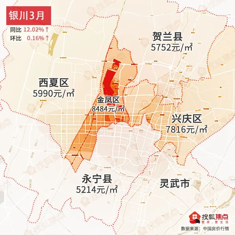 银川3月均价为7617元/㎡,同比上涨12.02%↑,环比上涨0.16%↑