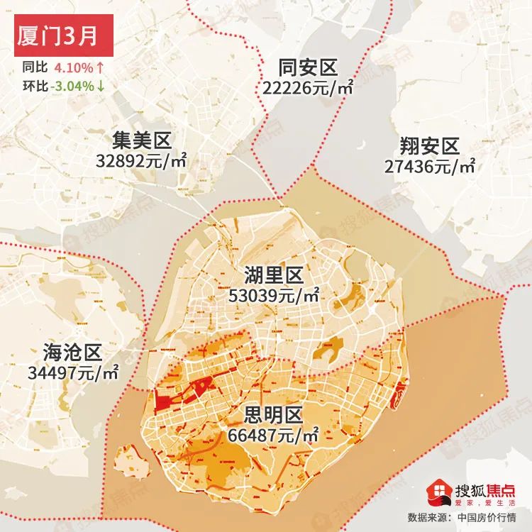 厦门3月均价为36770元/㎡,同比上涨4.10%↑,环比下降-3.04%↓