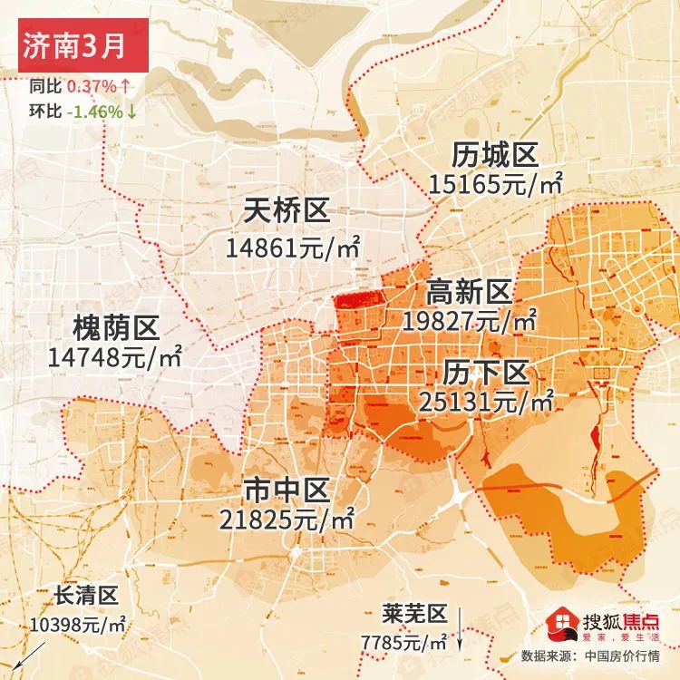 济南3月均价为16314元/㎡,同比上涨0.37%↑,环比下降-4.48%↓