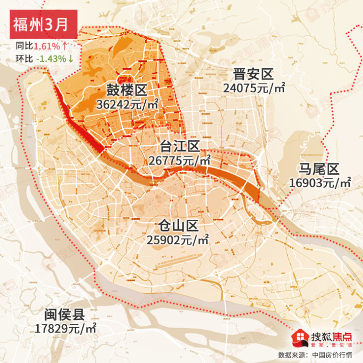 福州3月均价为26566元/㎡,同比上涨1.61%↑,环比下降-1.43%↓