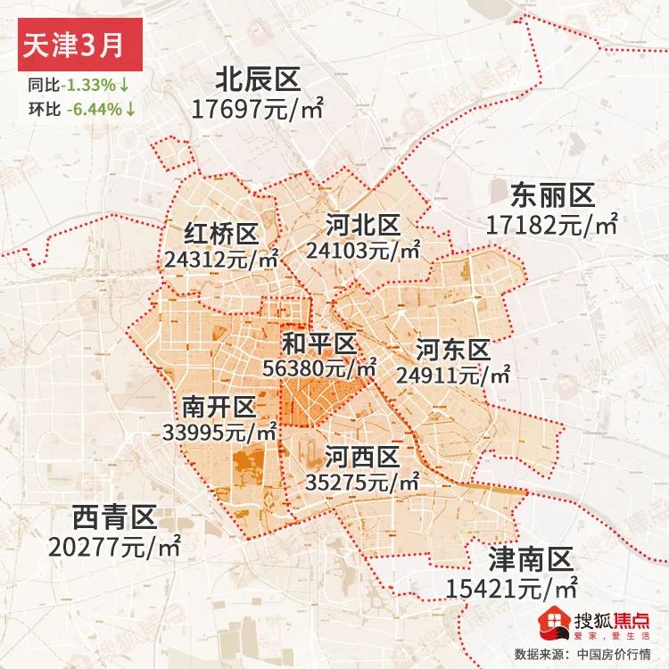 天津3月均价为27373元/㎡,同比下降-1.33%↓,环比下降-6.44%↓