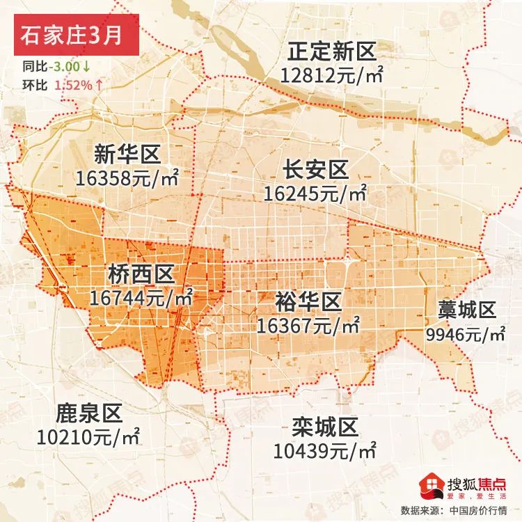 石家庄3月均价为14633元/㎡,同比下跌-3.00%↓,环比上涨1.52%↑