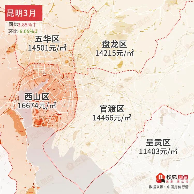 昆明3月均价为14226元/㎡,同比上涨3.85%↑,环比下降-6.05%↓