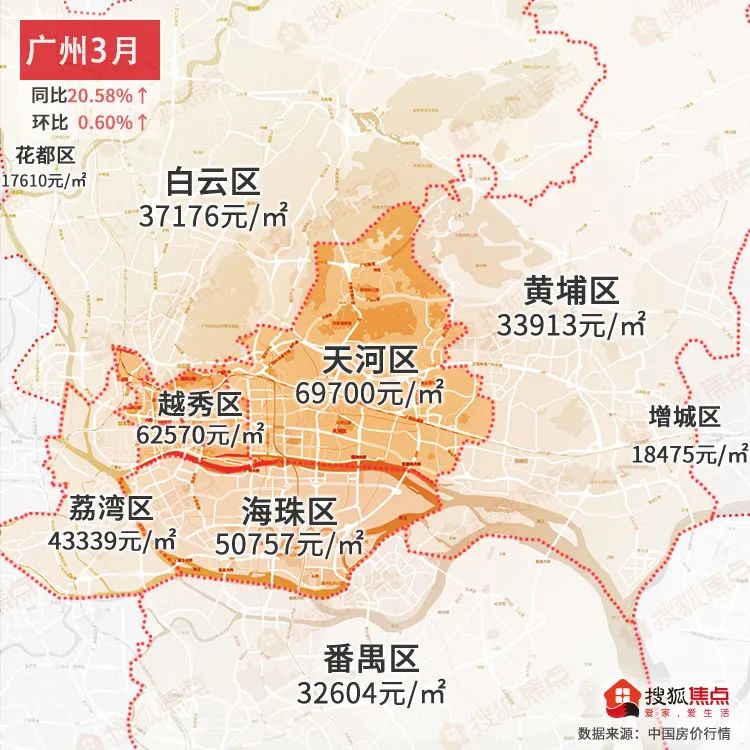 广州3月均价为42849元/㎡,同比上涨20.58%↑,环比上涨0.60%↑