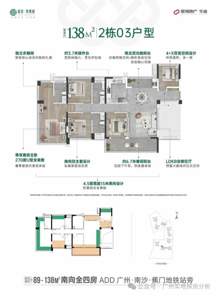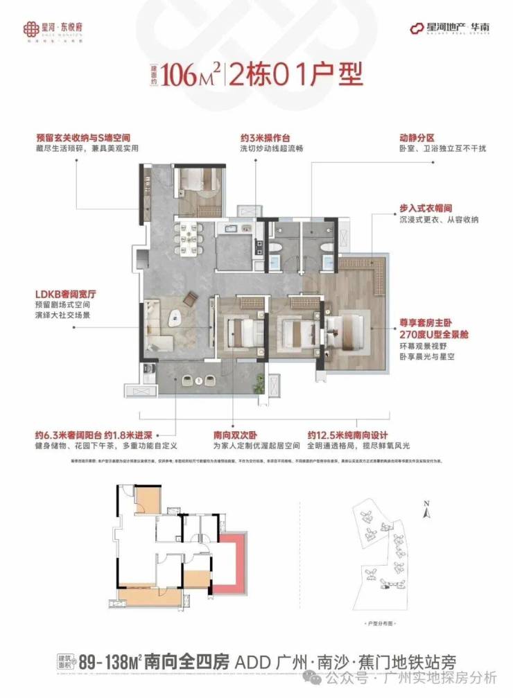 开发商:星河控股 开盘时间:2025年10月17日交付时间:2028年4月30日,精装修总占地面积:4.57万㎡总建筑面积:约20.29万㎡总栋数:9栋,分两期开发总户数:约1140户容积率:约3.38绿化率:约30%楼层高:3米梯户比:两梯四户、两梯五户使用率:至高128%车位数:约1336个,1:1.17物业管理:星河智善生活,物业费2.8元/㎡产品:89/106/122㎡全四房/138㎡双主套