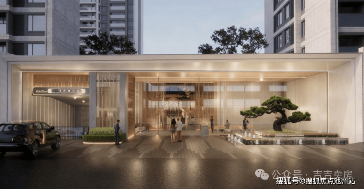 以“顶级酒店入口仪仗”为蓝本,叠加东方“松石水韵”意境。约60米舒展形象展示面营造“步入即显贵”的仪式感;约30米艺术豪奢定制门厅,弱化传统社区门庭的阻隔感,强化尊崇迎宾感。
