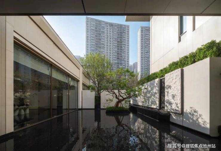 步入园区之后扑面而来的是度假感,水院围合出的一方天地让繁华与宁静在此转身,浓荫下是盈润流水,拂拭城市的喧嚣,让回家的心情在这里转换。“ 院落式景观、水院、树池、与矮景墙穿插,艺术水院 ”等场景打破建筑与室外的边界,室内外有机渗透,塑造层层递进的舒缓场景。