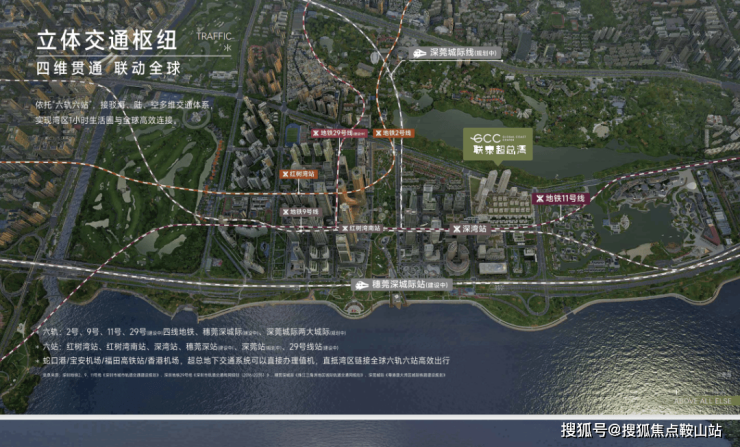 深超总规划"六轨六站"立体交通网络,包括地铁2、9、11号线,规划中的29号线以及穗莞深、深莞城际轨道。TOD模式实现站城一体化,无缝接轨三地铁换乘,引入城市航站楼值机服务,实现10分钟直达深圳湾口岸、20分钟通达前海的城市高效连接。滨海大道综合改造工程打造地下四层立体交通,汇聚城市道路、公交系统和城际铁路,成为大湾区交通核心节点。