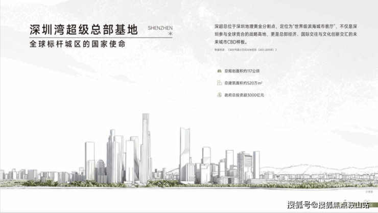 深超总被赋予打造全球城市"巅峰之作" ,"彰显中国气派的全球标杆城区"的战略定位,是世界级滨海客厅,代表国家参与全球城市竞争的核心引擎。目标打造全球总部集聚区、国际交流中心、都会文化高地为一体的未来城市