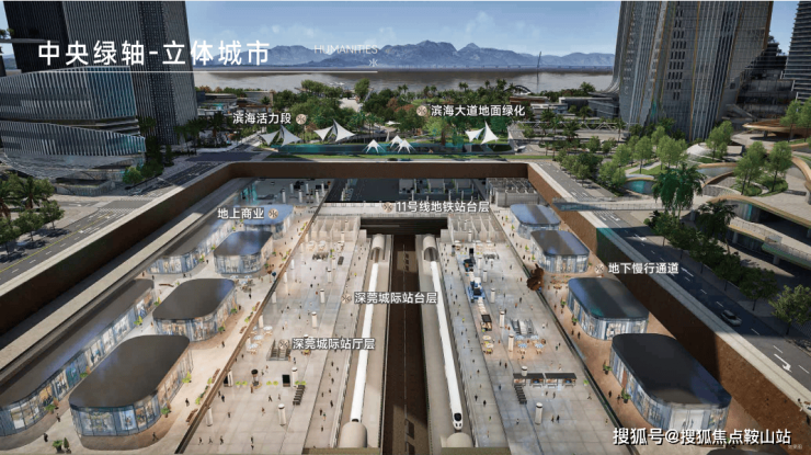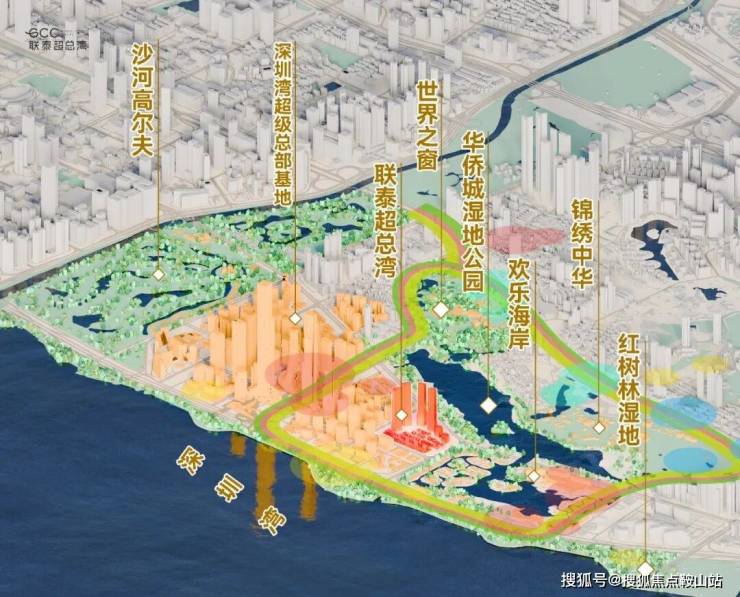 深超总拥有海、湖、湿地、公园、高尔夫五重稀缺生态资源,通过中央绿轴打造"超级校园"生态模式。滨海大道下沉,将释放约10万平方米地面空间,无缝连接深圳湾公园,形成连续的滨海公共空间。中央绿轴地下空间面积约30万平方米,投资95亿元,将建成连接地下枢纽与地面生态的超级系统。这种设计使深超总成为高密度城市环境下生态融合的典范,实现"在城市中漫步自然,在自然中享受城市"。