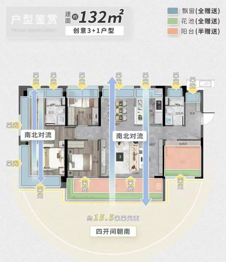 同面积段中罕见四开间朝南,南北通透,沐光格局
