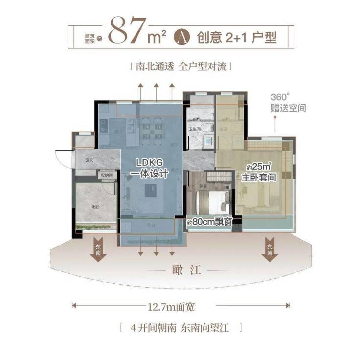 以一线江岸之境,匠造建面约87-132㎡瞰江藏品,全南向户型布局、超100%空间使用率,奢配80cm巨幕飘窗,独览一线江景与万象繁华。(部分户型配有)