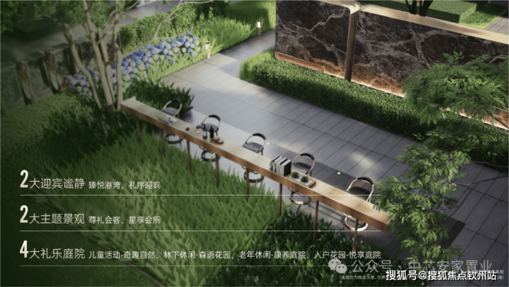 将自然之美与精致工艺融为一体,打造景观会客厅、艺术水景、户外吧台、阳光草坪等静谧空间。