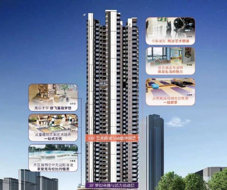 3楼做了空中泳池,另外有艺术书吧、童话乐园、运动天地等也做得很用心!!14楼是瑜伽区、休闲漫步区、棋弈区、赛车区。
