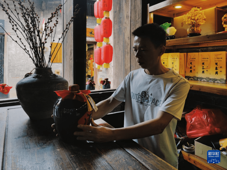 黄运化一路引领记者穿梭在古巷中,没过多时,记者被一家装潢朴实的店铺吸引,店门口层层叠叠堆满黄姚特色的黄精酒,门旁几串红灯笼已些许褪色,高悬的新制牌匾上方仍挂着字迹早已斑驳的旧木匾。