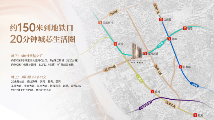 项目距离8号线宝岗大道地铁C出口仅200米,步行几分钟即达,是个妥妥的地铁盘,乘坐8号线,无论是去往老荔湾还算琶洲都非常方便,项目距离广佛线沙园站也才800米,步行大概14分钟左右,算的上是个双地铁楼盘