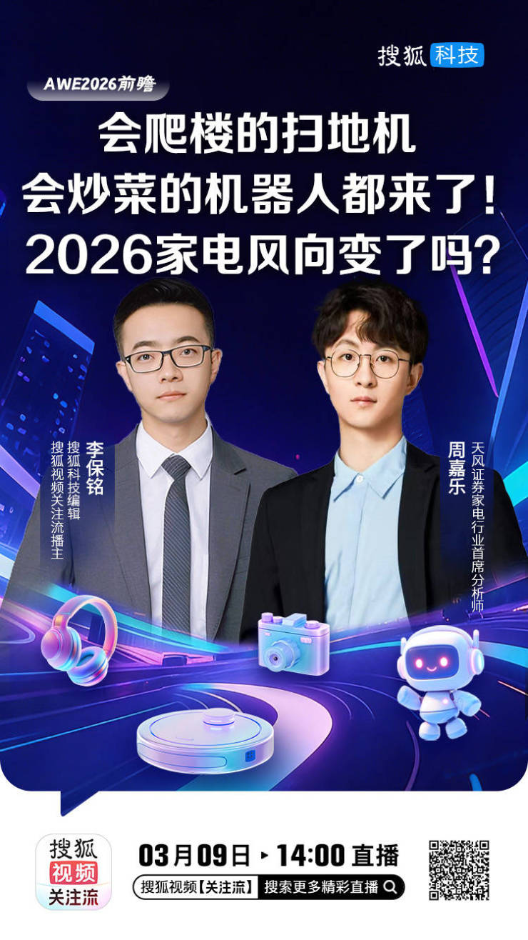 在内容形式上,AWE报道团将继续在搜狐视频关注流带来AWE直播活动。3月9日,天风证券家电行业首席分析师周嘉乐在搜狐视频关注流与搜狐科技编辑连麦直播,分享AWE2026及家电行业前沿趋势。