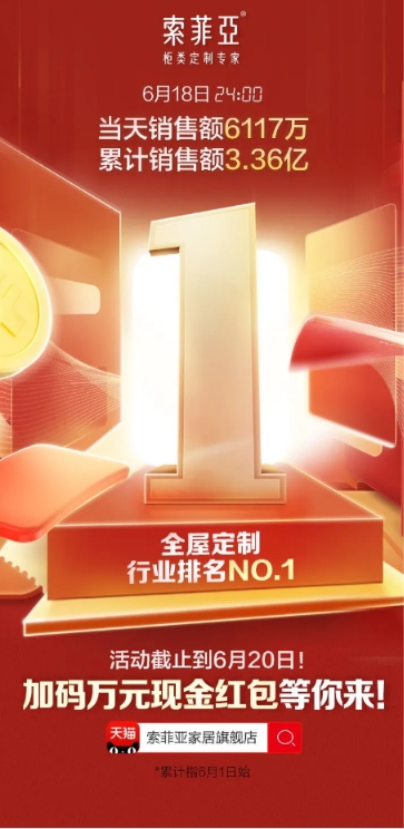 2021年618电商年中大促,索菲亚在天猫销售一路高歌猛进,618当天销售6117万,索菲亚天猫618的销售最终定格在3.36亿,成功蝉联全屋定制排名前列宝座。于此同时,在国内另一大平台京东上,索菲亚也交出了连续三年卫冕的优秀成绩单,无醛添加套装销售额更是同比增长47.88%,成为全屋定制行业内当之无愧的销售冠军。