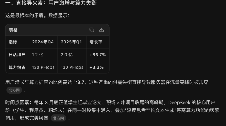 有业内观点认为,DeepSeek的免费策略是宕机的诱因。大模型运营成本极高,免费模式让平台算力扩容有限。大量免费用户无差别抢占资源,遇到卡顿后又反复点击重试,形成“流量雪崩”,进一步加重了服务器负担。