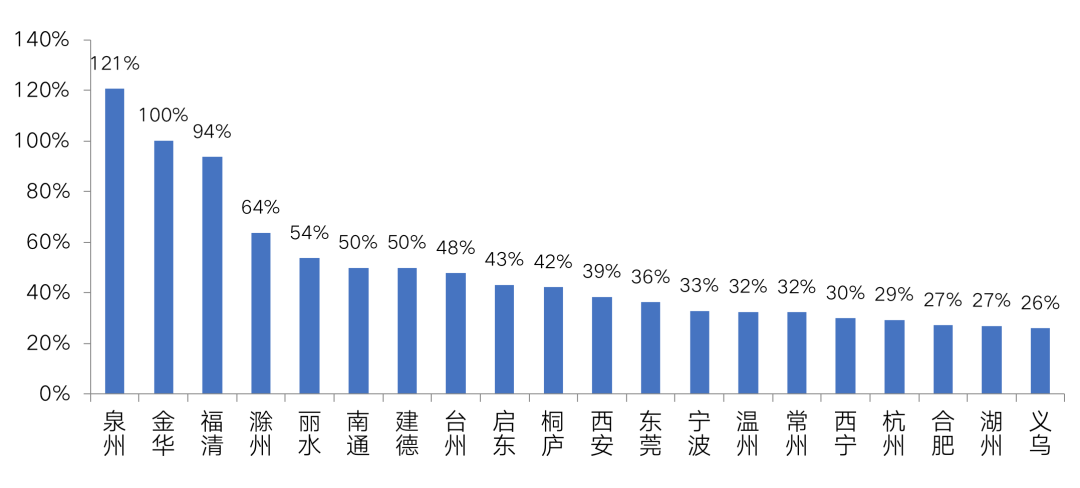 除长三角城市以外,泉州、东莞以及未在重点城市之列的西安和西宁两个二线城市市场热度也保持高位。其中溢价率较高的城市是泉州,高达121%。