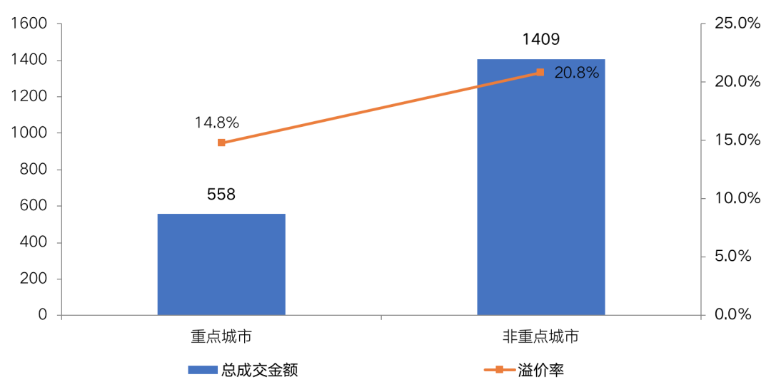 从成交情况来看,在“集中供地”新政出台后,受重点城市暂缓土地供应影响,非重点城市成交占比显著提升,升至72%,较新政出台前提升了约20个百分点,不仅如此,溢价率也出现了大幅增长,升至20.8%。