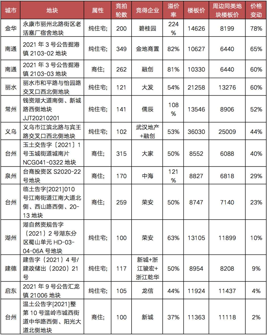 值得注意的是,从区域上看,“两集中”新政落地之后,非重点城市的热度上升的同时,高热地块进一步向郊县“下沉”,譬如南通的如东县、启东市、金华的永康市、义乌市,台州的玉环市、临海市、温岭市等等,均有竞拍轮数超百轮的高热地块成交。