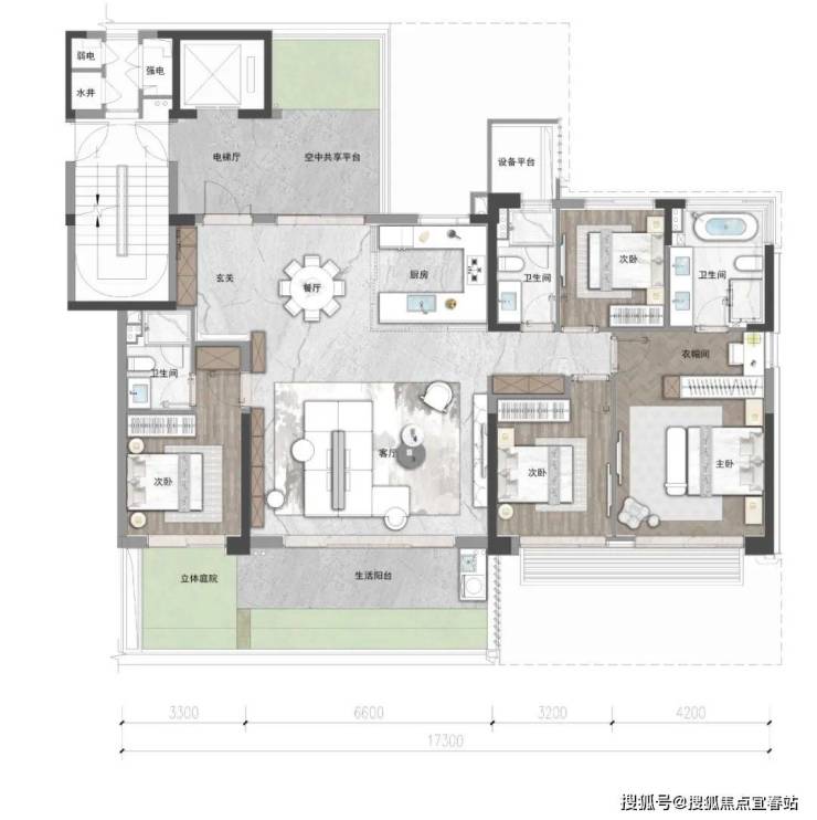 把空中平台+立体庭院+宽境阳台,悉数搬到平层,打造一个「空中花园大宅」。