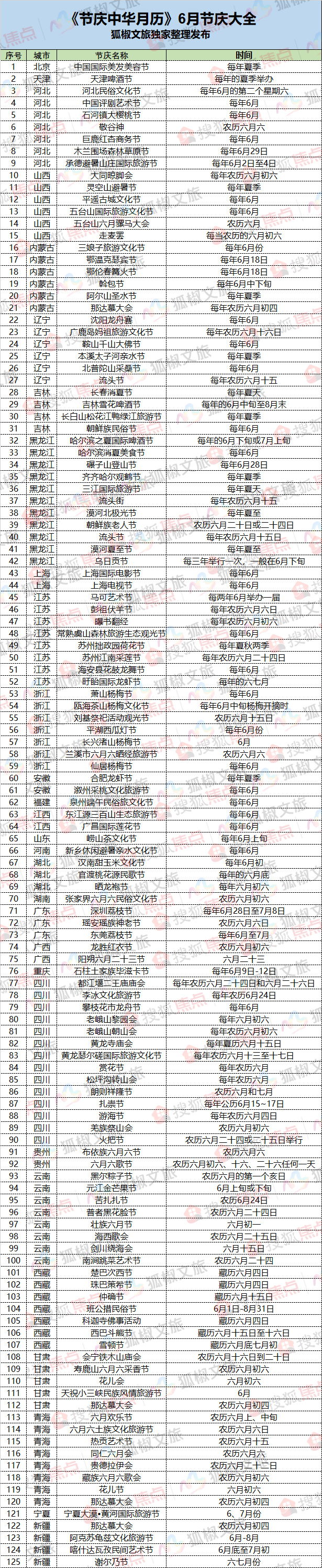 据统计,6月全国有约125个节庆项目展开,其中包含那达慕大会、瑶安瑶族神老节等传统节庆,以及天津啤酒节、石河镇大樱桃节等现代节庆。以下是6月全国各地具体节庆信息。