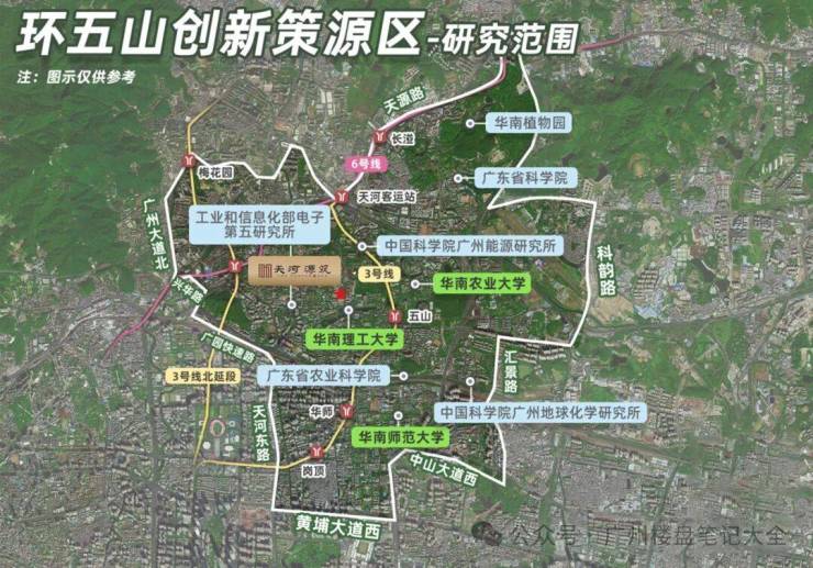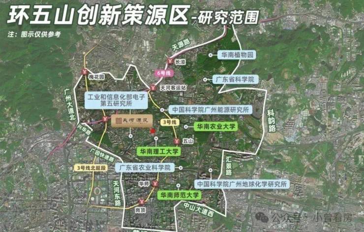 天河源筑位于东莞庄,号称天河北后花园,占位“环五山”创新策源区,距离珠城仅约4.5km,市中心核心的地段,已经足以令项目从一众新盘中脱颖而出。论规划,环五山创新策源区聚焦“人工智能+数字经济+科技创新”,关乎广州的下一个十年发展。