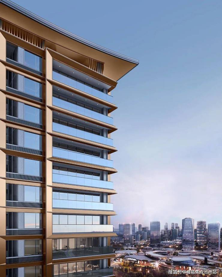第二,建筑设计上,项目成为公园里抬眼可赏的独特风景线。飞举的屋檐与挺拔的楼体,金属与玻璃,碰撞出轻盈飘逸又颇具辨识度的美感,以「居住封面地标」之姿与公园相互映衬。