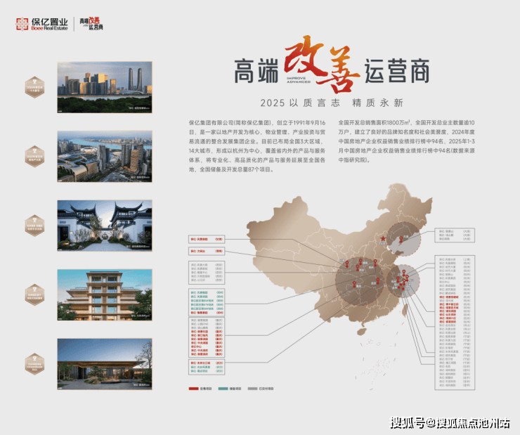 浙江品牌房企20强,2025年应势发布“高端改善运营商”的全新定位,秉承“美好生活精质家”的品牌理念,坚持精耕深拓,专注产品,稳健前行。已布局全国三大区域、14大重点城市。