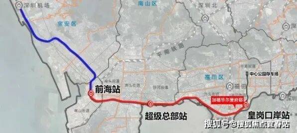 穗莞深城际(建设中)延长线——穗莞深城际前海至皇岗口岸段设有皇岗口岸站,途径南山、福田等地,建成通车后2站到前海,1站到深圳湾总部基地。