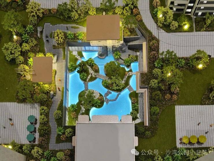 下沉式景观的部分可以看到水系用的比较多,其中布置了三个绿植岛台,用一座小桥和一系列汀步串联起来。但景观的最终呈现还是要看实景,看模型和图都不太准确,到时候有实景展示区了再给大家做详细解析。