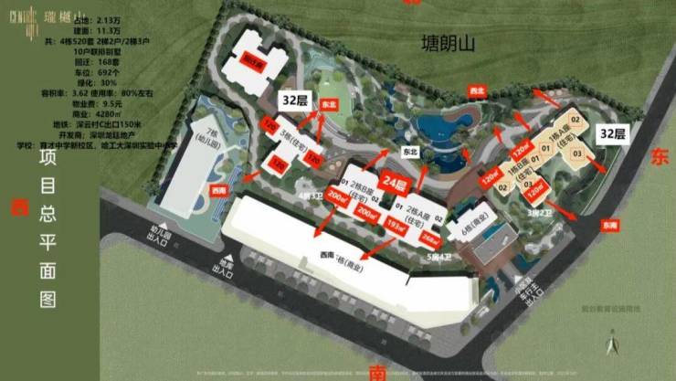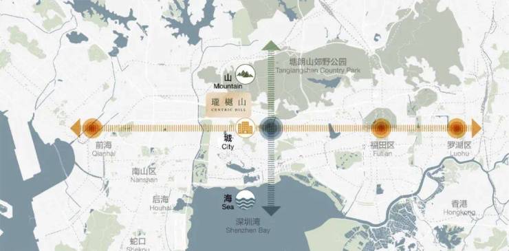 1、中心区域:深圳山海城中轴,左手香蜜湖、右手华侨城,六大总部基地环伺