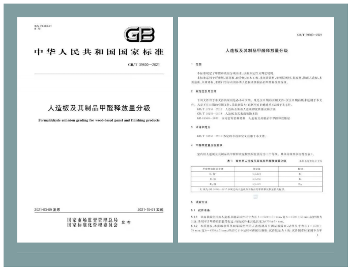 由全国人造板标准化技术委员会归口管理的GB/T39600-2021《人造板及其制品甲醛释放量分级》和GB/T39598-2021《基于极限甲醛量的人造板室内承载限量指南》正式发布。其中将室内用人造板及其制品的甲醛释放量分为三个等级:E1级、E0级、ENF级,分别对应不同的限量值。